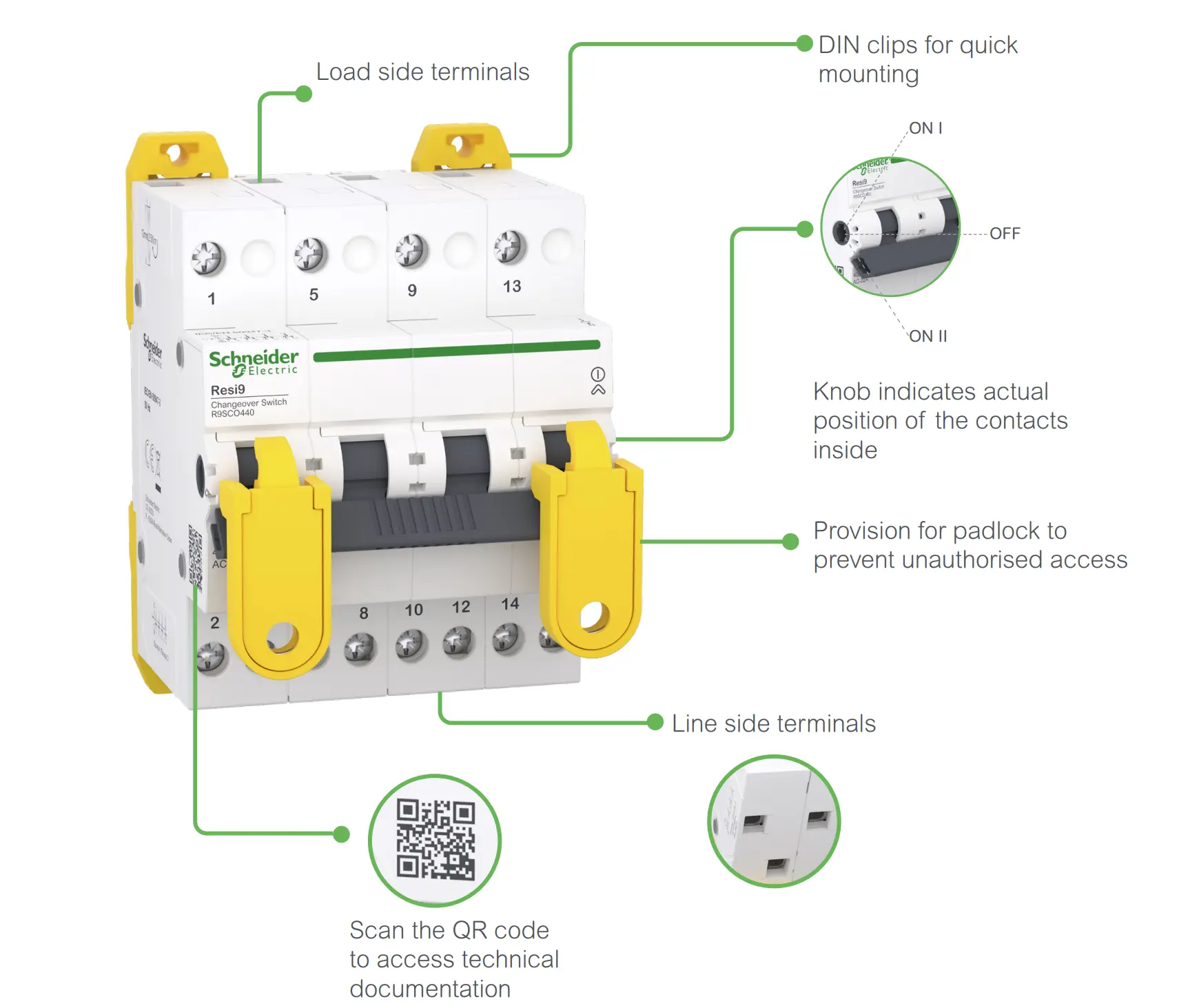 The Resi9 Changeover Switches provide perfect solution for low voltage distribution systems that need a continuous power supply. The Changeover Switch range comprises of 40 A and 63 A in 2P and 4P versions. The Resi9 Changeover Switches are suitable for electrical panels in residential and small buildings